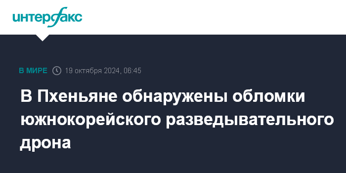 Москва. 19 октября. INTERFAX.RU - В одном из районов столицы Северной Кореи найдены обломки южнокорейского "малоразмерного дрона дистанционной разведки", Пхеньян угрожает Сеулу войной, если подобные провокации продолжатся, сообщает ЦТАК со ссылкой на Минобороны КНДР.