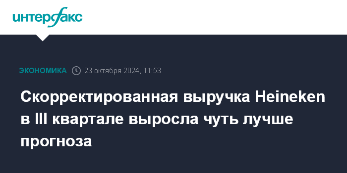Москва. 23 октября. INTERFAX.RU - Heineken, вторая по величине пивоваренная компания в мире, в третьем квартале 2024 года зафиксировала рост скорректированной выручки на 3,3% в органическом выражении, тогда как консенсус-прогноз аналитиков, составленный самой компанией, предусматривал рост на 3,2%.