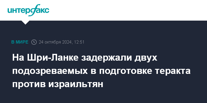Москва. 24 октября. INTERFAX.RU - На Шри-Ланке задержали двух граждан по подозрению в планировании теракта против израильтян на острове, сообщает в четверг The Times of Israel.