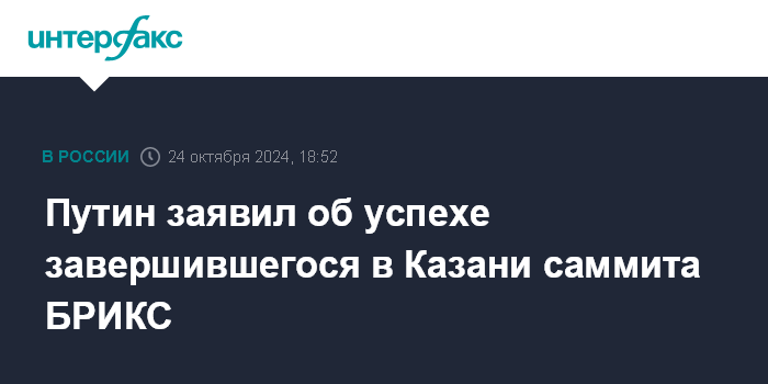 Москва. 24 октября. INTERFAX.RU - Президент РФ Владимир Путин заявил об успехе завершившегося в Казани саммита БРИКС и о том, что Россия как страна-председатель объединения справилась со своей задачей.