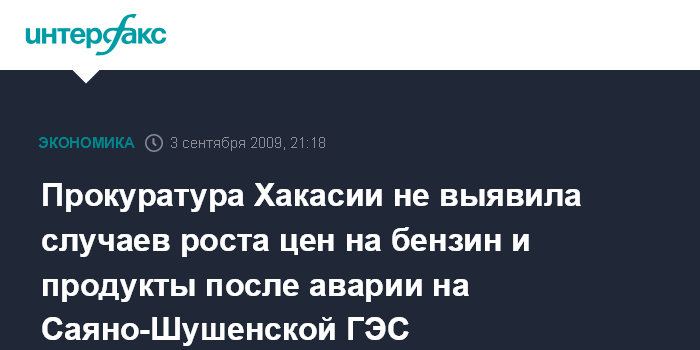 Москва. 3 сентября. INTERFAX.RU – Прокуратура Хакасии провела проверку информации СМИ о повышении цен на бензин и товары первой необходимости после аварии, произошедшей на Саяно-Шушенской ГЭС.
