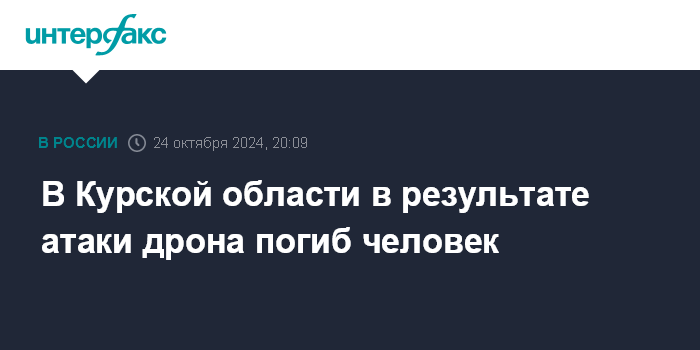 Москва. 24 октября. INTERFAX.RU - В Рыльском районе Курской области беспилотник атаковал автомобиль, погиб находившийся в салоне мужчина, сообщил губернатор региона Алексей Смирнов.