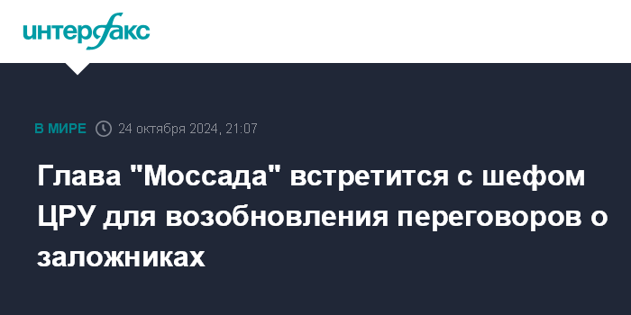 Москва. 24 октября. INTERFAX.RU - Глава израильской разведки "Моссад" Давид Барнеа направится 27 октября в Доху на встречу с премьер-министром Катара Мухаммедом бен Абделем Рахманом Аль Тани и шефом ЦРУ Уильямом Бернсом о возобновлении переговоров об освобождении израильских заложников.