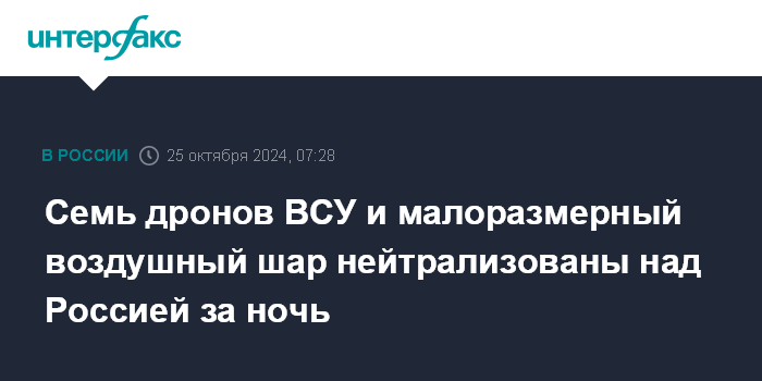 Москва. 25 октября. INTERFAX.RU - В ночь на пятницу система ПВО нейтрализовала над территорией РФ семь украинских беспилотников и один малоразмерный воздушный шар, сообщило российское Минобороны.