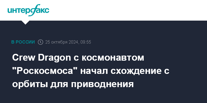 Crew Dragon с космонавтом "Роскосмоса" начал схождение с орбиты для приводнения