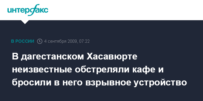 Ростов-на-Дону. 4 сентября. ИНТЕРФАКС-ЮГ - В Дагестане неизвестные ночью обстреляли кафе в городе Хасавюрте, а затем бросили в него взрывное устройство, после чего кафе загорелось, жертв и пострадавших нет.