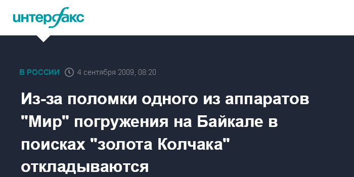 Москва. 4 сентября. INTERFAX.RU - Один из глубоководных обитаемых аппаратов (ГОА) "Мир" на Байкале из-за неисправности не может совершать погружения, поэтому руководитель проекта "Миры" на Байкале" депутат Госдумы Артур Чилингаров принял решение отложить поиски "золота Колчака".
