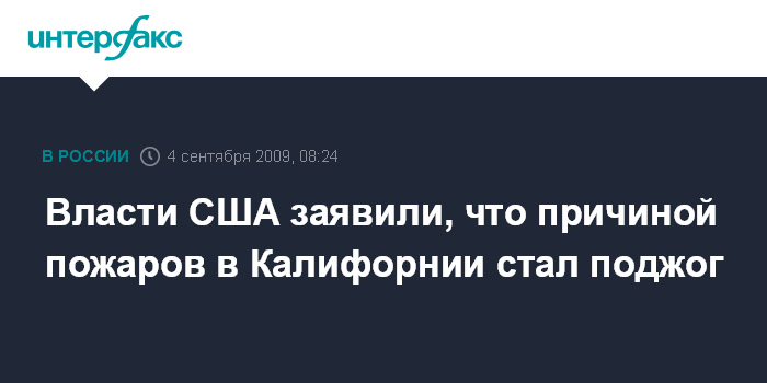 Москва. 4 сентября. INTERFAX.RU - Американские власти сообщают, что причиной лесных пожаров, которые бушуют уже неделю к северу от Лос-Анджелеса, стал поджог, передает в пятницу британская телерадиовещательная корпорация ВВС.