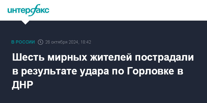 Москва. 26 октября. INTERFAX.RU - Шесть мирных жителей пострадали в результате удара по Горловке в Донецкой народной республике, сообщил мэр города Иван Приходько.