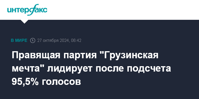По последним данным, после подсчета 95,5% голосов лидирует правящая партия "Грузинская мечта" - 54,22%.