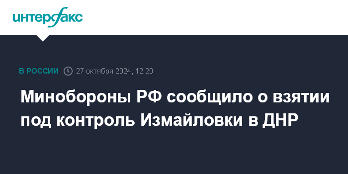 Москва. 27 октября. INTERFAX.RU - Российские военные установили контроль над селом Измайловка в ДНР, заявили в Минобороны РФ в воскресенье.