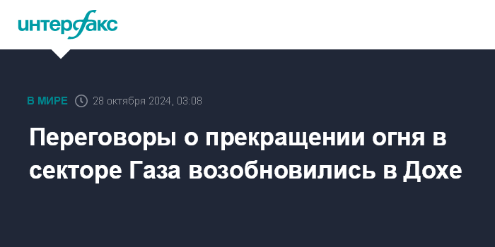 Москва. 28 октября. INTERFAX.RU - Новый раунд переговоров посредников Израиля и ХАМАС в попытке достичь соглашения о прекращении огня в секторе Газа и освобождении заложников стартовал в столице Катара Дохе в воскресенье, сообщает CNN.