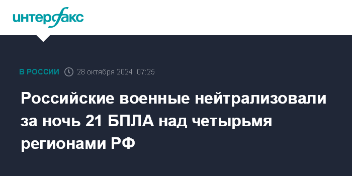Москва. 28 октября. INTERFAX.RU - Средствами противовоздушной обороны прошедшей ночью уничтожен и перехвачен 21 украинский дрон над Белгородской, Брянской, Воронежской и Курской областями, сообщили в Минобороны РФ.