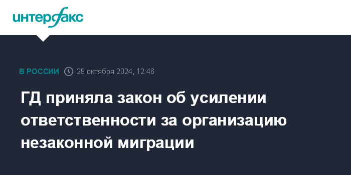 Москва. 29 октября. INTERFAX.RU - Госдума на заседании во вторник приняла во втором и затем в третьем чтении закон об отнесении к числу особо тяжких преступлений организацию незаконной миграции, совершенную организованной группой или в целях совершения тяжких или особо тяжких преступлений.