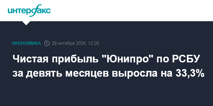 Москва. 29 октября. INTERFAX.RU - Чистая прибыль ПАО "Юнипро" по РСБУ за девять месяцев 2024 года выросла на 33,3% в годовом измерении, до 31,6 млрд рублей, говорится в отчете компании.
