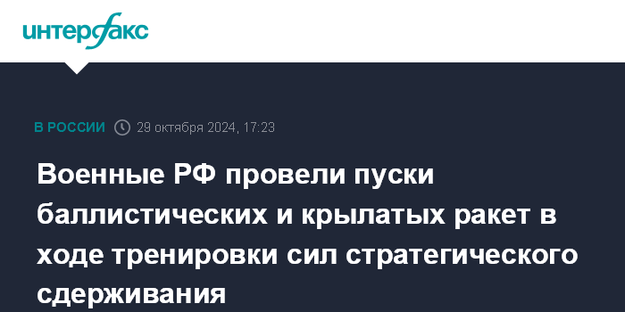Москва. 29 октября. INTERFAX.RU - Минобороны РФ сообщило, что в ходе тренировки сил стратегического сдерживания во вторник состоялись практические пуски баллистических и крылатых ракет - с космодрома "Плесецк", из акватории Баренцева и Охотского морей, они достигли целей.