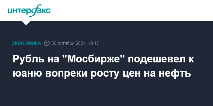 Москва. 30 октября. INTERFAX.RU - На торгах среды на "Московской бирже" рубль немного подешевел к юаню, несмотря на рост котировок нефти. К 19:00 юань торговался на уровне 13,6005 рубля, что на 2,35 копейки выше уровня закрытия предыдущих торгов.