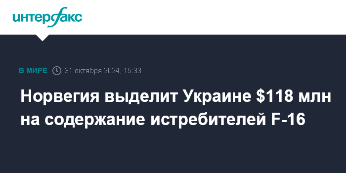 Москва. 31 октября. INTERFAX.RU - Министр обороны Норвегии Бьорн Арильд Грам объявил о выделении Киеву $118 млн на поддержание боеспособности истребителей F-16, говорится в пресс-релизе норвежского правительства.