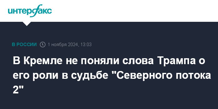 Москва. 1 ноября. INTERFAX.RU - В Кремле не понимают, что имел в виду кандидат в президенты США Дональд Трамп, сказав, что именно он уничтожил газопровод "Северный поток 2", заблокировав его строительство, и связывают это с предвыборной горячкой.