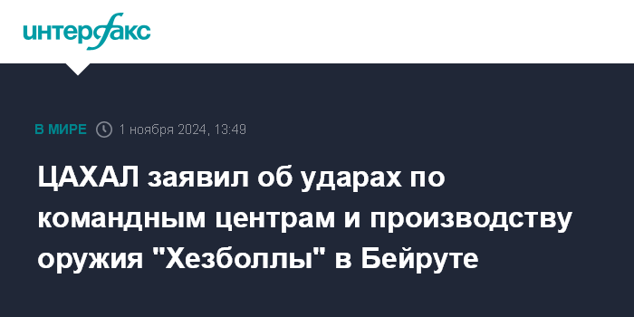 Москва. 1 ноября. INTERFAX.RU - Армия обороны Израиля (ЦАХАЛ) в пятницу сообщила, что на основе разведданных израильские ВВС атаковали командные центры движения "Хезболла" в Бейруте, а также предприятия по производству оружия.