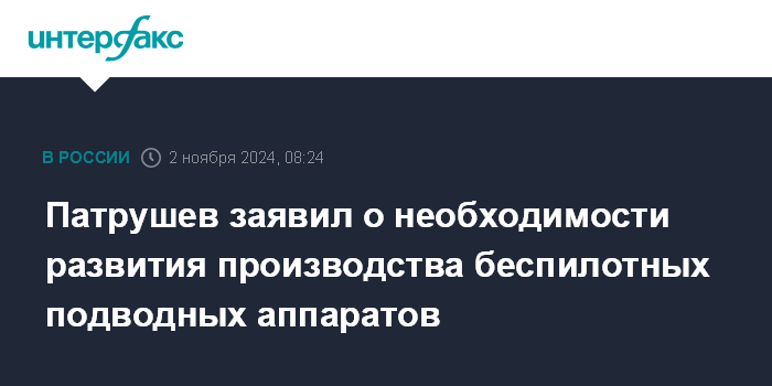 Москва. 2 ноября. INTERFAX.RU - В России необходимо развивать производство безэкипажных подводных аппаратов и робототехнических комплексов, создать единый центр компетенций по их разработке, сообщил помощник президента РФ, председатель Морской коллегии Николай Патрушев.