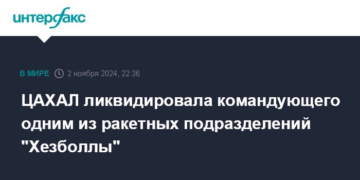 Москва. 2 ноября. INTERFAX.RU - Армия обороны Израиля (ЦАХАЛ) заявила о ликвидации командира одного из ракетных подразделений ливанского шиитского движения "Хезболла".