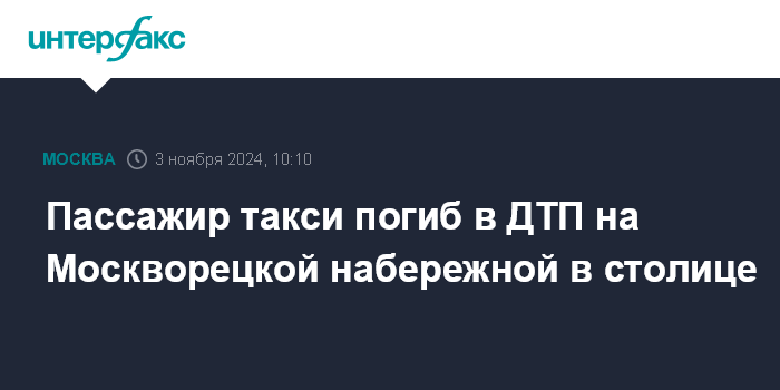 Москва. 3 ноября. INTERFAX.RU - Авария с участием такси произошла на Москворецкой набережной в столице. Как сообщает прокуратура Москвы, погиб пассажир такси - мужчина 1977 года рождения, есть пострадавшие.