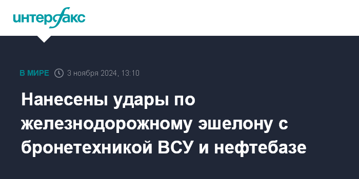 Москва. 3 ноября. INTERFAX.RU - Российские военные заявили, что в течение суток поразили железнодорожный эшелон с бронетехникой ВСУ, объекты энергетики и инфраструктуру военных аэродромов Украины.