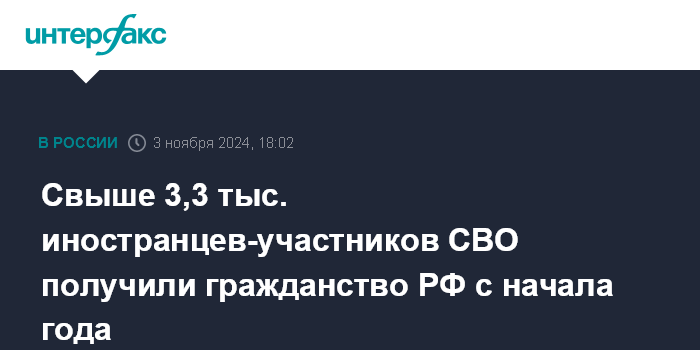 Москва. 3 ноября. INTERFAX.RU - Российское гражданство с начала 2024 года получили более 3,3 тыс. иностранных граждан - участников специальной военной операции, сообщила официальный представитель МВД России Ирина Волк.