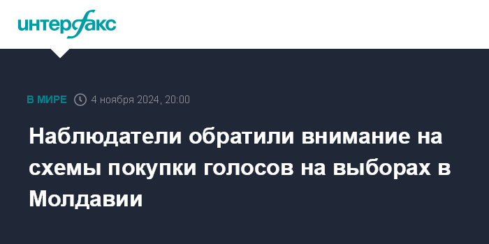 Москва. 4 ноября. INTERFAX.RU - Второй тур президентских выборов в Молдавии проходил на фоне расследований вмешательства из-за рубежа и схем покупки голосов, говорится в предварительном отчете миссии наблюдателей БДИПЧ-ОБСЕ, Европарламента, Парламентской ассамблеи ОБСЕ и ПАСЕ, представленном в понедельник.