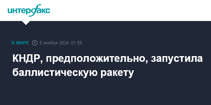 Москва. 5 ноября. INTERFAX.RU - Минобороны Японии сообщило о возможном пуске баллистической ракеты с территории Северной Кореи, передает японский телеканал NHK.