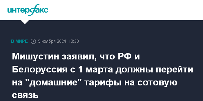 Москва. 5 ноября. INTERFAX.RU - Сотовые операторы России и Белоруссии с 1 марта 2025 года должны обеспечить тарификацию звонков и интернет-трафика в рамках Союзного государства (СГ) на сопоставимом с "домашней" сетью уровне, заявил премьер-министр РФ Михаил Мишустин.