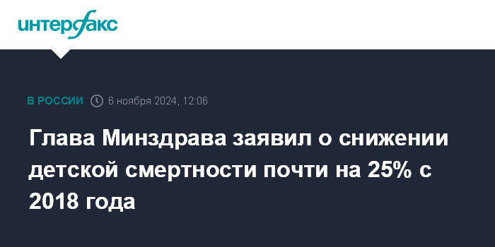 Москва. 6 ноября. INTERFAX.RU - Детская смертность в России снизилась почти на 25% с начала реализации в 2018 году национального проекта "Здравоохранение", сообщил в Совете Федерации министр здравоохранения Михаил Мурашко.