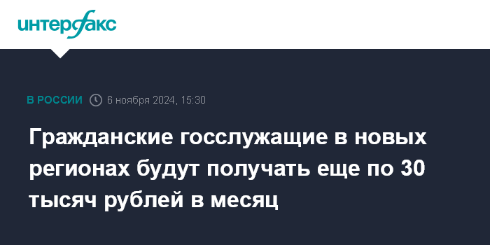 Гражданские госслужащие в новых регионах будут получать еще по 30 тысяч рублей в месяц