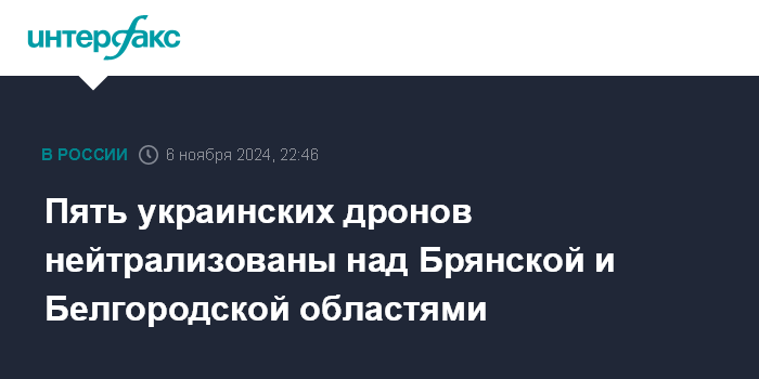 Пять украинских дронов нейтрализованы над Брянской и Белгородской областями