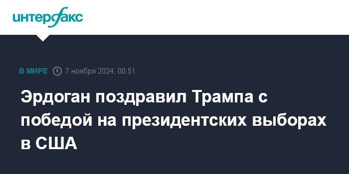 "Президент Эрдоган провел телефонный разговор с избранным президентом США Дональдом Трампом, которого он поздравил с победой", - говорится в сообщении, опубликованном в соцсети Х.
