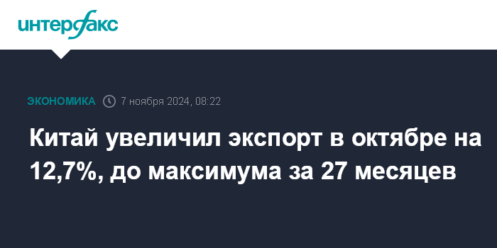 Москва. 6 ноября. INTERFAX.RU - Китай увеличил экспорт в октябре на 12,7% в годовом выражении - до $309 млрд, максимума за 27 месяцев, сообщило Главное таможенное управление КНР.