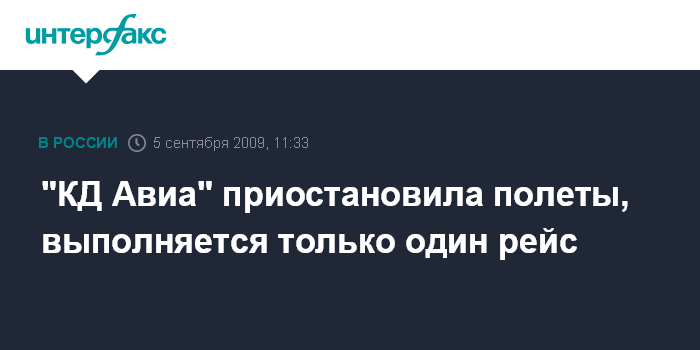 Москва. 5 сентября. INTERFAX.RU - Калининградская компания "КД Авиа" по состоянию на субботу почти полностью приостановила все свои полеты и выполняет только единственный рейс по маршруту Москва-Калининград, сообщил "Интерфаксу" официальный представитель Федерального агентства воздушного транспорта (Росавиация) Сергей Извольский.