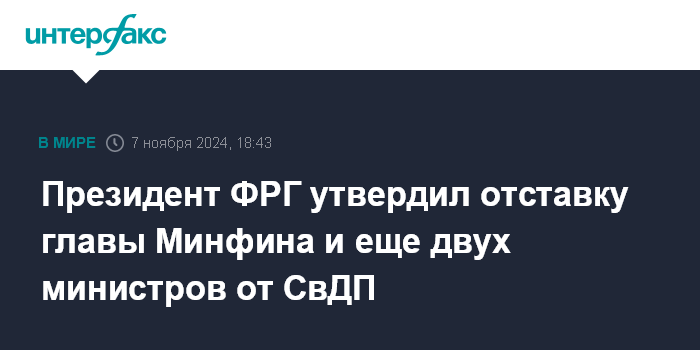 Москва. 7 ноября. INTERFAX.RU - Президент ФРГ Франк-Вальтер Штайнмайер в четверг подтвердил отставку сразу трех министров от Свободной демократической партии Германии (СвДП), ранее состоявшей в правящей коалиции, в том числе министра финансов Кристиана Линднера.