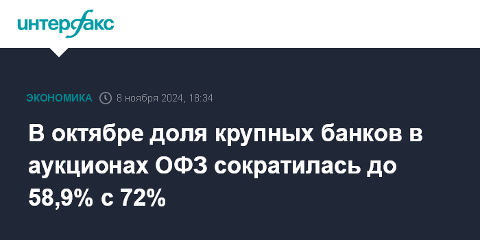 В октябре доля крупных банков в аукционах ОФЗ сократилась до 58,9% с 72%