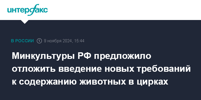 Москва. 9 ноября. INTERFAX.RU - Минкультуры РФ предлагает перенести срок введения новых требований по содержанию животных в цирках с 2025 на 2030 год, это связано с тем, что циркам требуется больше времени для переоборудования. Об этом сообщили журналистам в ведомстве в субботу.