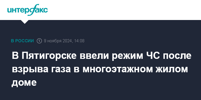 Москва. 9 ноября. INTERFAX.RU - Режим чрезвычайной ситуации муниципального уровня введен в Пятигорске (Ставропольский край) после взрыва бытового газа в многоэтажном доме, сообщил глава города Дмитрий Ворошилов.