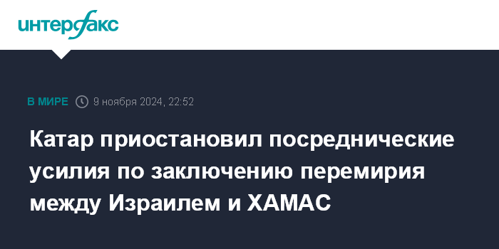 Москва. 9 ноября. INTERFAX.RU - Из-за отсутствия прогресса в переговорах между Израилем и ХАМАС по перемирию в секторе Газа Катар приостановил посреднические усилия, говорится в сообщении МИД страны в субботу.