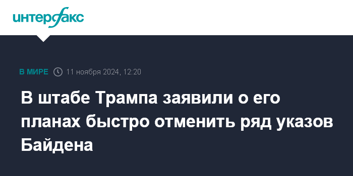 Москва. 11 ноября. INTERFAX.RU - Избранный президент США Дональд Трамп в течение первой недели на посту главы государства отменит все идущие вразрез с его политикой указы уходящего президента Джозефа Байдена, сообщила в интервью телеканалу Fox News представитель штаба Трампа Кэролайн Ливитт.