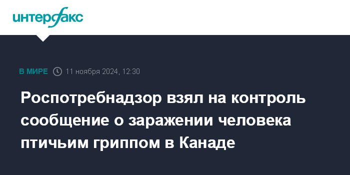 По имеющийся информации, на которое ссылается ведомство, в Британской Колумбии (провинция на западе Канады) впервые зафиксирован случай птичьего гриппа у человека, вызванный вирусом гриппа H5. Уточняется, что заболевшим является подросток. На данный момент других случаев не выявлено. В ведомстве отметили, что с начала 2024 года вспышки вируса гриппа птиц регистрируются по всему миру.