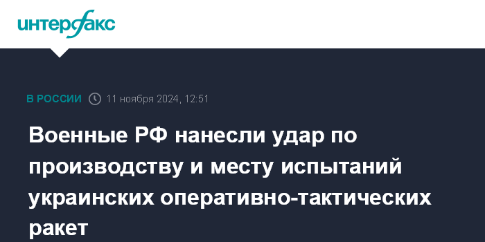 Военные РФ нанесли удар по производству и месту испытаний украинских оперативно-тактических ракет