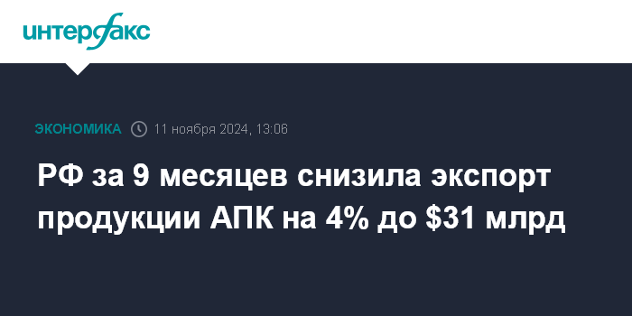 РФ за 9 месяцев снизила экспорт продукции АПК на 4% до $31 млрд