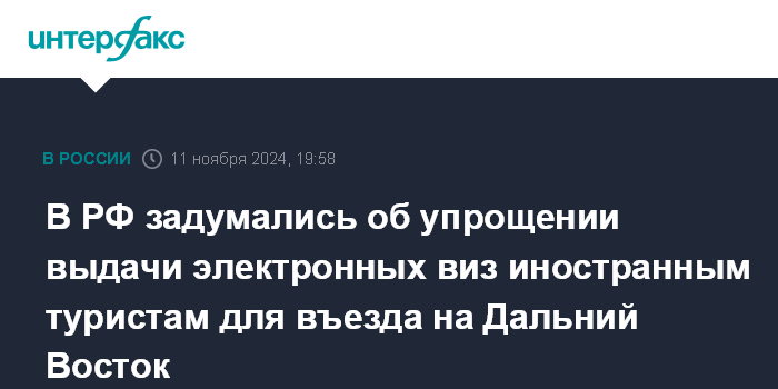 Москва. 11 ноября. INTERFAX.RU - Президент РФ Владимир Путин поручил правительству совместно с МИД, МВД и ФСБ рассмотреть возможность упрощения порядка выдачи электронных виз для въезда иностранных граждан на территорию Дальневосточного федерального округа в туристических целях.