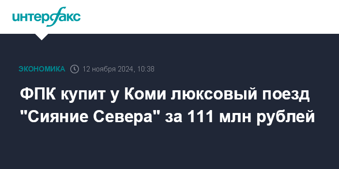Москва. 12 ноября. INTERFAX.RU - АО "Федеральная пассажирская компания" (ФПК) купит у республики Коми за 110,7 млн рублей туристический поезд "Сияние Севера", сообщает пресс-служба республиканского комитета имущественных и земельных отношений.