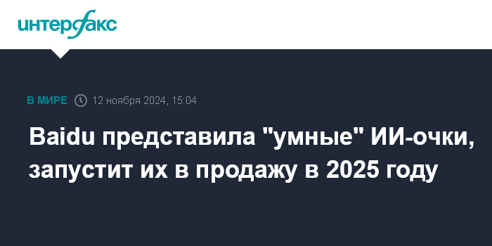 Москва. 12 ноября. INTERFAX.RU - Китайский интернет-гигант Baidu представил "умные" очки с технологиями искусственного интеллекта (ИИ), пишет Financial Times.